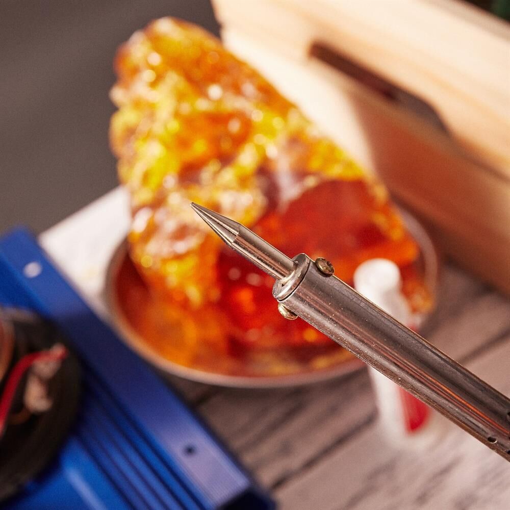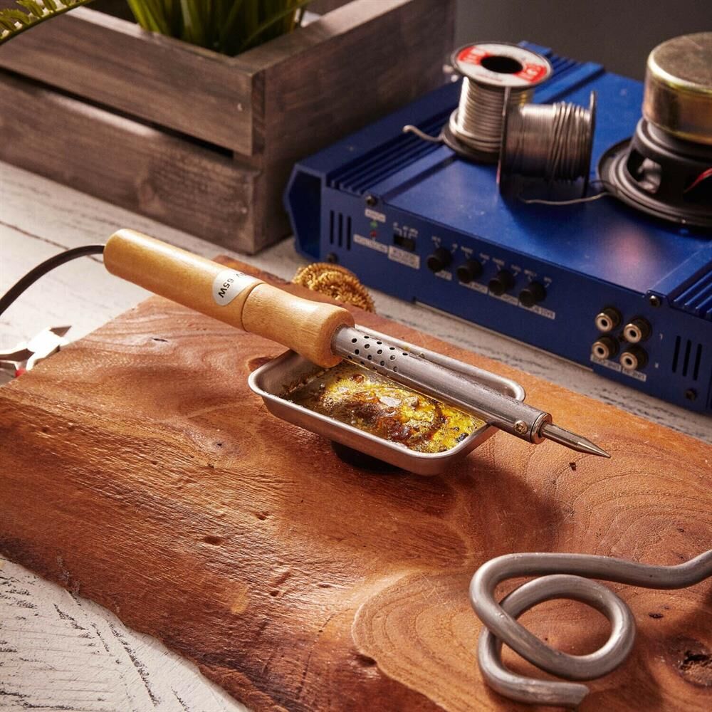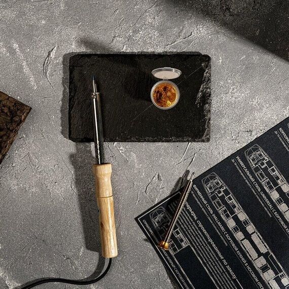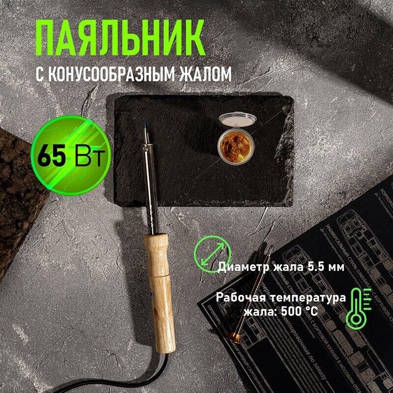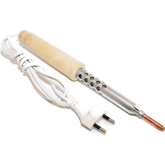 Электрический паяльник с деревянной ручкой и конусообразным жалом непрерывного нагрева предназначен для монтажной пайки и лужения оловянно-свинцовистыми припоями элементов радиоэлектронной аппаратуры и тонкостенных металлических изд-й в производственных и бытовых условиях. Перед началом эксплуатации электрического паяльника паяльное жало следует подвергнуть лужению. тех инфо: Uвх: 220-230 В 50/60 Гц Pпотр: 65 Вт Длина провода: 1.35 м Масса: 0,13 кг