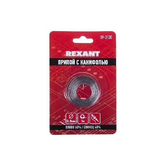 Припой REXANT (09-3130) ПРИПОЙ С КАНИФОЛЬЮ , 1 М, 0.8 ММ, (ОЛОВО 60%, СВИНЕЦ 40%), СПИРАЛЬ, БЛИСТЕР