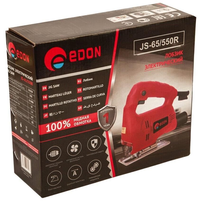 Лобзик электрический сетевой Edon JS-65/550R это инструмент с пильным металлическим полотном для узорного выпиливания. Основные характеристики: Напряжение - 220 В.; Потребляемая мощность - 550 Вт.; Частота вращения шпинделя на холостом ходу - 3000 об/мин.; Макс. глубина пропила (дерево/металл) - 65/4 мм.; Величина хода пилки - 18 мм.; Длина сетевого кабеля - 2 м.