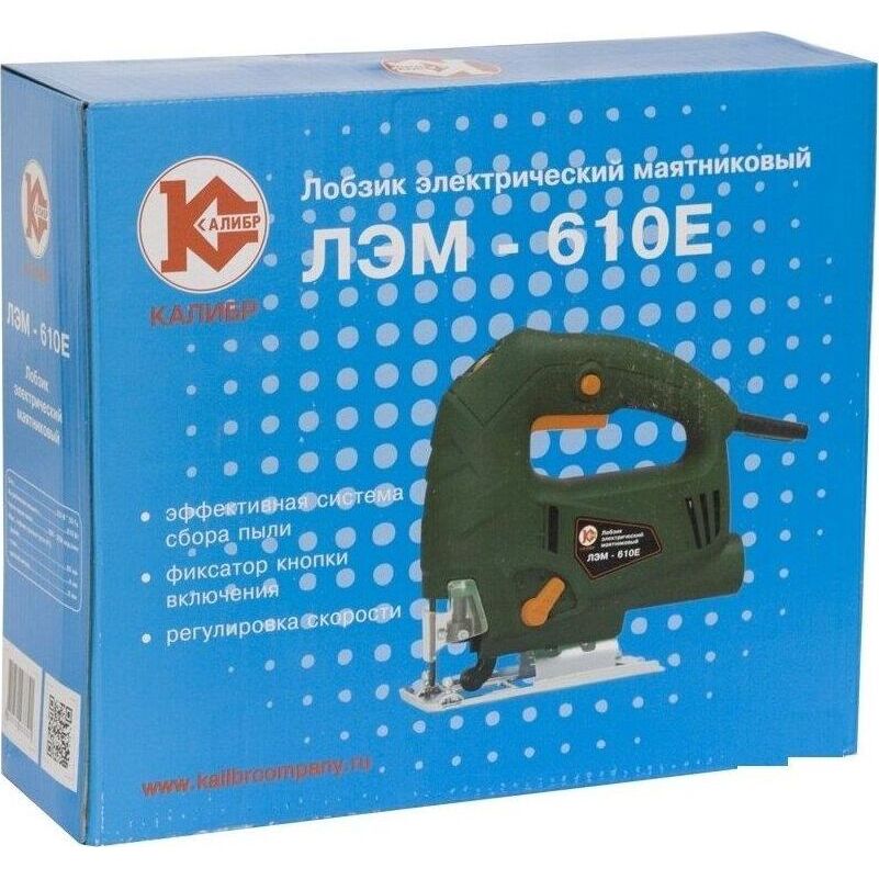 Ручной электрический маятниковый лобзик Калибр ЛЭМ-610Е с регулировкой скорости предназначен для прямолинейного и фигурного пиления дерева, пластмассы,чёрных и цветных металлов и других строительных материалов в быту,Регулировка скорости хода; Переходник для подключения пылесоса; Кожух защитный пластмассовый; Кнопка фиксации клавиши выключателя; Регулировка угла наклона; Маятниковый ход,Характеристики,Потребляемая мощность 610 Вт,Скорость хода пильного полотна без нагрузки 0-3000 ход/мин,Величина хода пилки 18 мм,Угол наклона резки +/- 450,Максимальная глубина пропила: дерево 65 мм,сталь 4 мм,цветной металл 10 мм,Уровень звукового давления 89 дБ(А),Длина шнура питания, не менее 2 м,Электродвигатель,Однофазный коллекторный,Функция маятникового движения,4-е положения,Номинальное напряжение/Частота 230 В/50 Гц,Габариты в упаковке (ДхШхВ) 255х82х225 мм,Вес (брутто/нетто) 2,0/1,8 кг