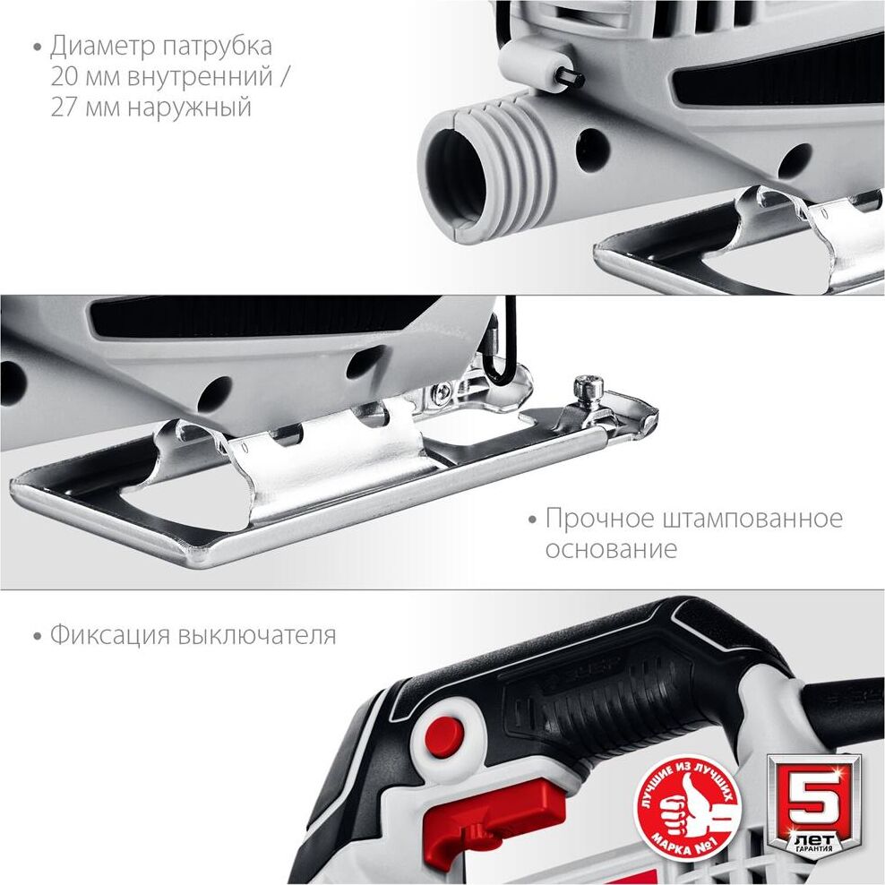Мощность, Вт 400. Частота ходов пилки, ход/мин 0-3000. Ход пилки, мм 18. Макс. толщина пропила (дерево), мм 55. Макс. толщина пропила (металл), мм 6. Макс. толщина пропила (цветной металл), мм 10. Тип патрона пилкодержателя Т-образный. Быстрозажимной патрон есть. Электронная регулировка оборотов. Диаметр патрубока (внутренний/наружный), мм 22/27. Напряжение питания, В/Гц 230/50.