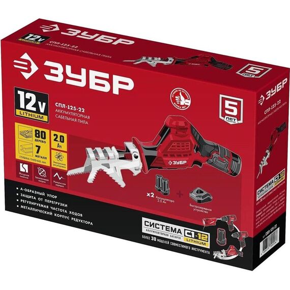 Пила сабельная ЗУБР СПЛ-125-22 12В, 2 АКБ (2Ач), в коробке, пила сабельная