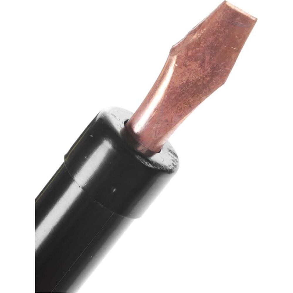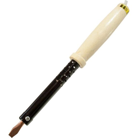 Электрический паяльник со спиральным нагревателем (ЭПСН) питается напрямую от сети 220 В, рабочая темпа рабочего стержня 500...540 °С, время разогрева до рабочей темп — 8 мин., класс защиты — II. Размеры жала: Диаметр: 7,4 мм. Длина: 85 мм. Габаритные размеры без шнура: 255x26x26 мм.