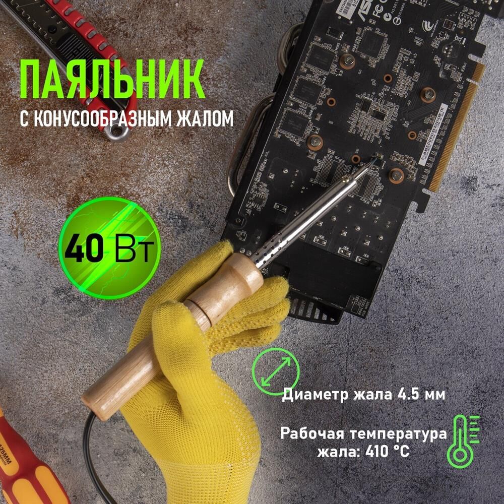Электрический паяльник с деревянной ручкой и конусообразным жалом непрерывного нагрева предназначен для монтажной пайки и лужения оловянно-свинцовистыми припоями элементов радиоэлектронной аппаратуры и тонкостенных металлических изд-й в производственных и бытовых условиях. Перед началом эксплуатации электрического паяльника паяльное жало следует подвергнуть лужению. Тех инфо: Uвх: 220-230 В 50/60 Гц. Pпотр: 40 Вт. Длина провода: 1.35 м. Масса: 0.13 кг.