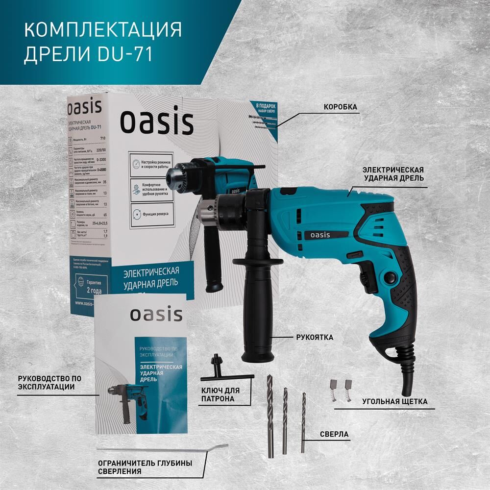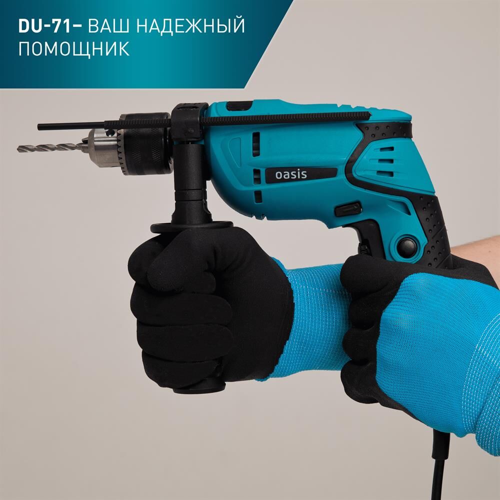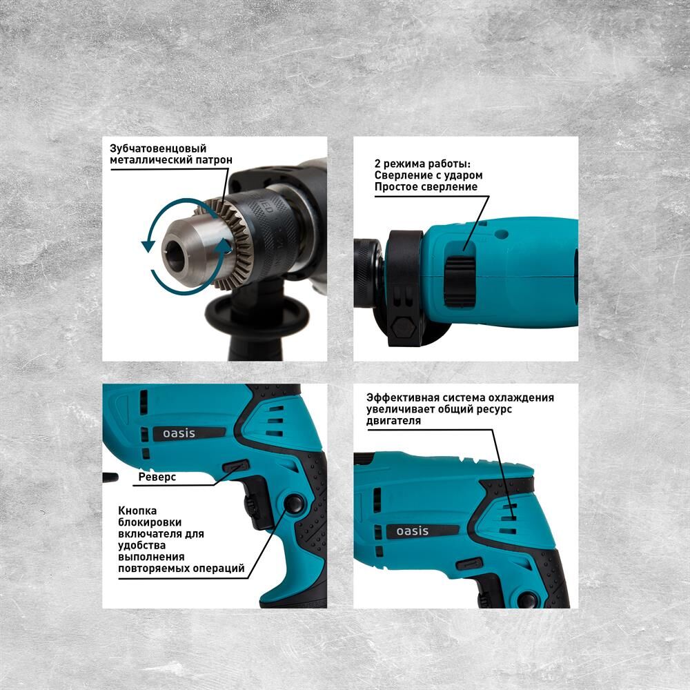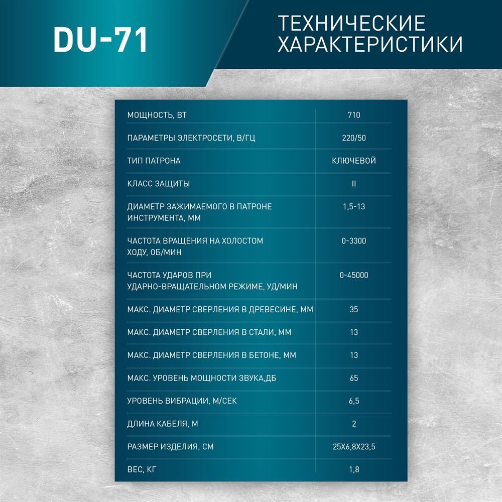 Мощность 710 Вт; 220/50 В/Гц; 0-3300 об/мин; 0-45000 уд/мин; ключевой патрон; диаметр сверла 13 мм; Максимальный диаметр сверления в древесине 35 мм; Максимальный диаметр сверления в стали 13 мм; Максимальный диаметр сверления в бетоне 13 мм; рверс; регулировка скорости
