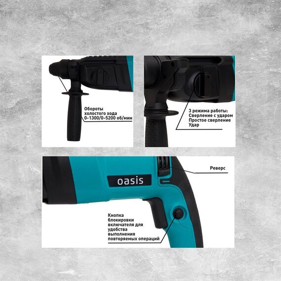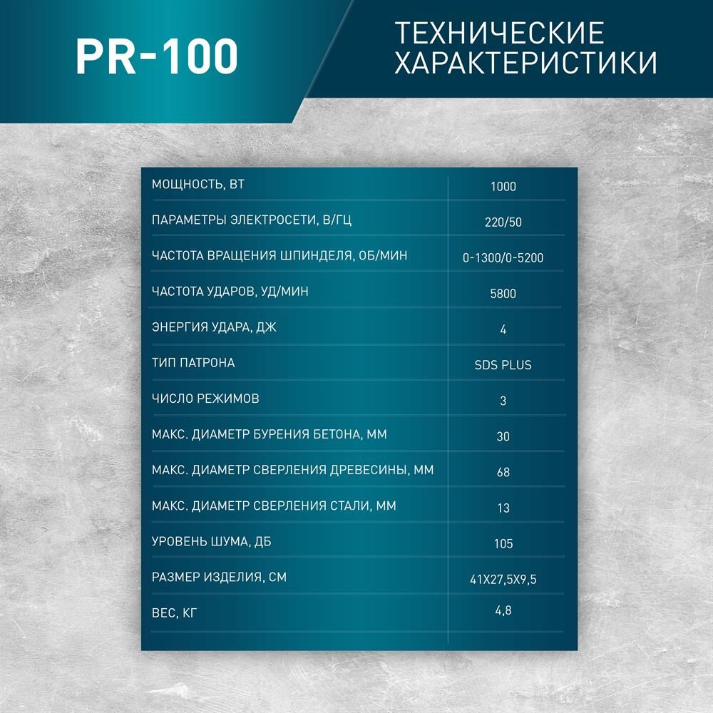 Мощность 1000 Вт; 220/50 В/Гц; 0-870/0-4580 об/мин; 5800 уд/мин; 2,8 Дж; Патрон SDS-Plus; Максимальный диаметр сверления в древесине 45 мм; Максимальный диаметр сверления в стали 13 мм; Максимальный диаметр сверления в бетоне 26 мм; реверс; 3 скорости.