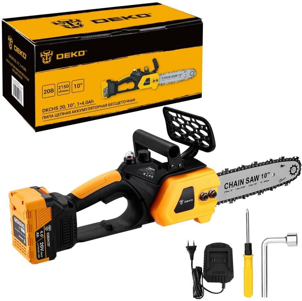 Пила цепная аккумуляторная бесщеточная DEKO DKCHS 20, 10 , 20В, 1x4.0Ач, з/у 083-2000