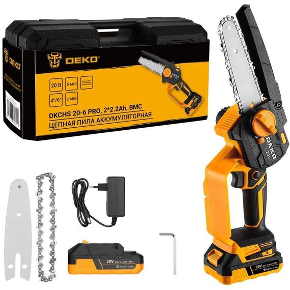 Пила цепная аккумуляторная DEKO DKCHS 20-6 PRO, 4" и 6", 20В, 2x2.2Ач, 2 шины и 2 цепи в кейсе 083-2012