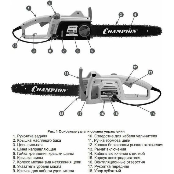 Пила цепная электрическая CHAMPION 418N-16" 3/8-1,3-57 (1,8кВт 3,8кг)
