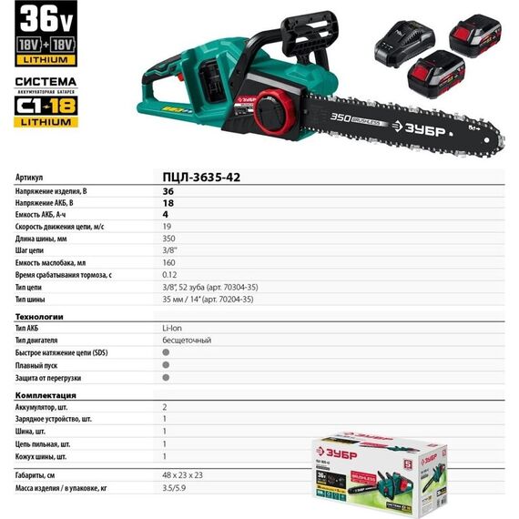 Пила цепная ЗУБР ПЦЛ-3635-42 36В бесщеточная пила цепная, 2х18В АКБ (4Ач).