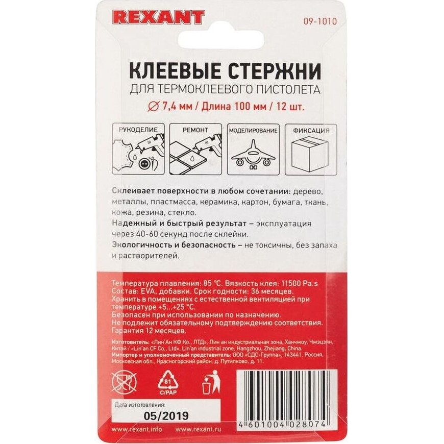 Диаметр стержня: 7.4 мм. Длина стержня: 100 мм. Температура плавления: 85С. Вязкость клея: 11500 Pa.s. Цвет: прозрачный. 12 ШТ.