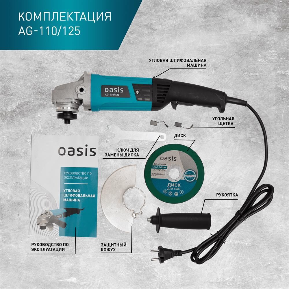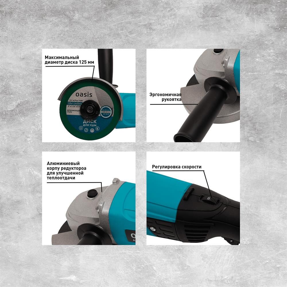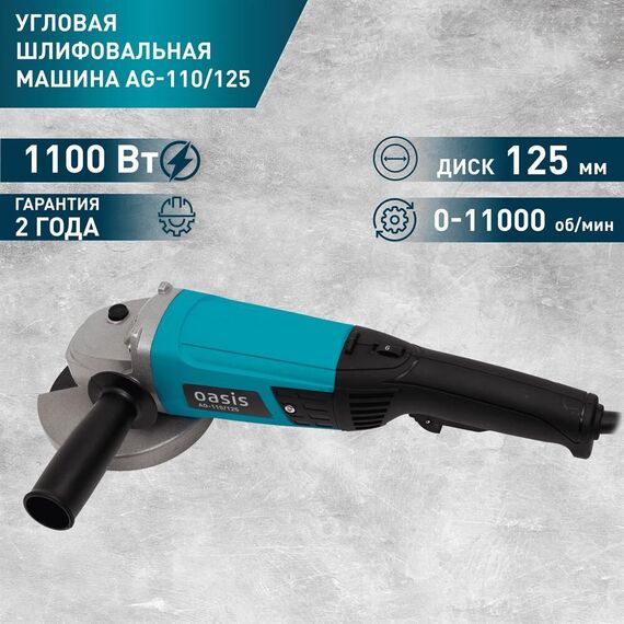 Мощность 1100 Вт; 220/50 В/Гц; диаметр диска 125 мм; Диаметр посадочного отверстия шлифкруга 22 мм; 3000-11000 об/мин;