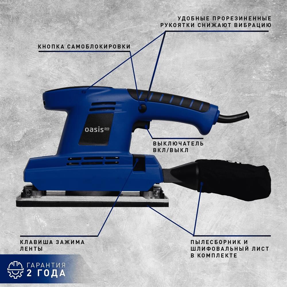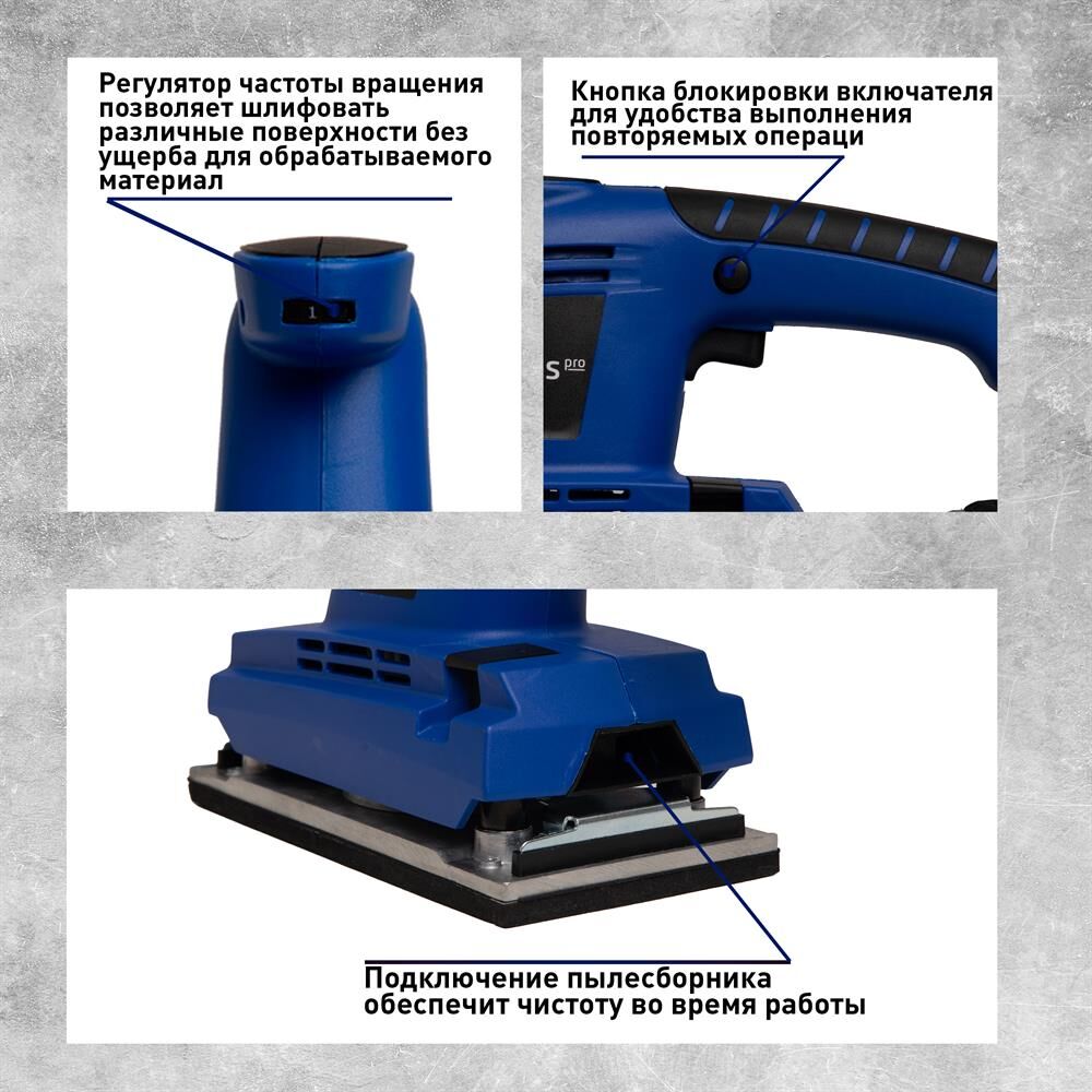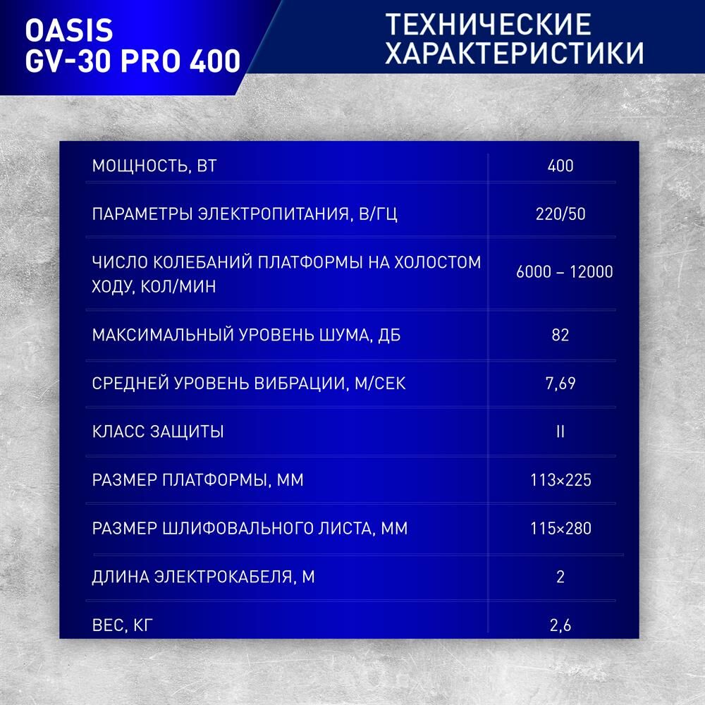 Мощность, Вт 400. Параметры электропитания, В/Гц 220/50. Число колебаний платформы на холостом ходу, кол/мин 6000-12000. Размер платформы, ШхД мм 113х225. Размер шлифовального листа, мм 115х280. Размеры изделия, см 30х11,3х18. Вес нетто, кг 2,6.
