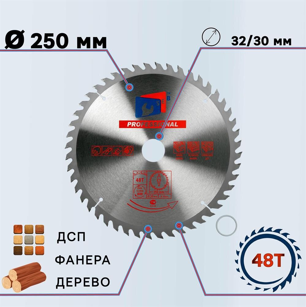 Диск пильный BELMASH 250x3,0/2,0x32/30, 24T с твердосплавными напайками, которые делают зубья износостойкими, способными сопротивляться повышенным ударным нагрузкам. Назначение: для деревообрабатывающих многофункциональных, циркулярных, форматно-раскроечных станков, дисковых и торцовочных пил и т. п. Можно устанавливать на станки BELMASH: UNIVERSAL-2000, UNIVERSAL-2500E, MOGILEV 2.4, MOGILEV 2.0, MOGILEV 2.4 ECO, SDMP-2200 , SDM-2000M, CBS-2000, TS-250ST1000, TS-250ST1000/400, TS-250ST1300, TS-250ST1300/400, TS-250ST1600, TS-250ST1600/400, TS-250R, TS-250R (1.8 кВт, 400 В), LTS-250 – 220 V, LTS-250 – 380 V Градусы заточки: передний угол 15 градусов, задний угол 15 градусов. Тип зуба ATB: переменные зубья с разносторонним углом наклона главной задней поверхности. Максимальная частота вращения – 6100 об./мин. Посадочный диаметр - 32 мм. В комплекте имеется переходное кольцо на внутренний диаметр 30 мм. Применение: быстрый поперечный и продольный распил древесины, фанеры, МДФ, ДСП, ОСП.