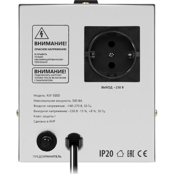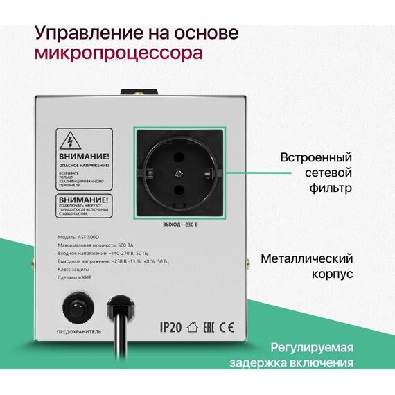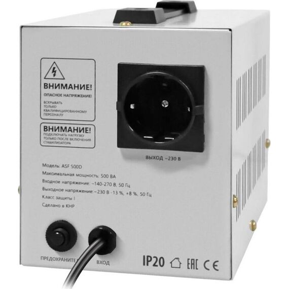 Автоматический стабилизатор напряжения, встроенный сетевой фильтр, мощность при входящем напряжении 220В - 500 ВА, мощность при входящем напряжении 170В - 300 ВА,номинальное выходное напряжение 230В -13%, +8%, номинальная частота переменного тока 50 Гц, число фаз -1, защитные функции: - защита от повышенного напряжения, от пониженного напряжения, от перегрева, от перегрузки, диапазон входного напряжения - 140–270 В, способ подключения - штепсельные разъемы типа "F", количество розеток - 1 шт., розетки с заземлением - 1 шт., дисплей LED, габаритные размеры - 16.3 x 22.2 x 12.4 см.