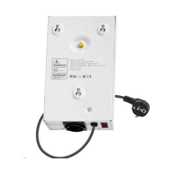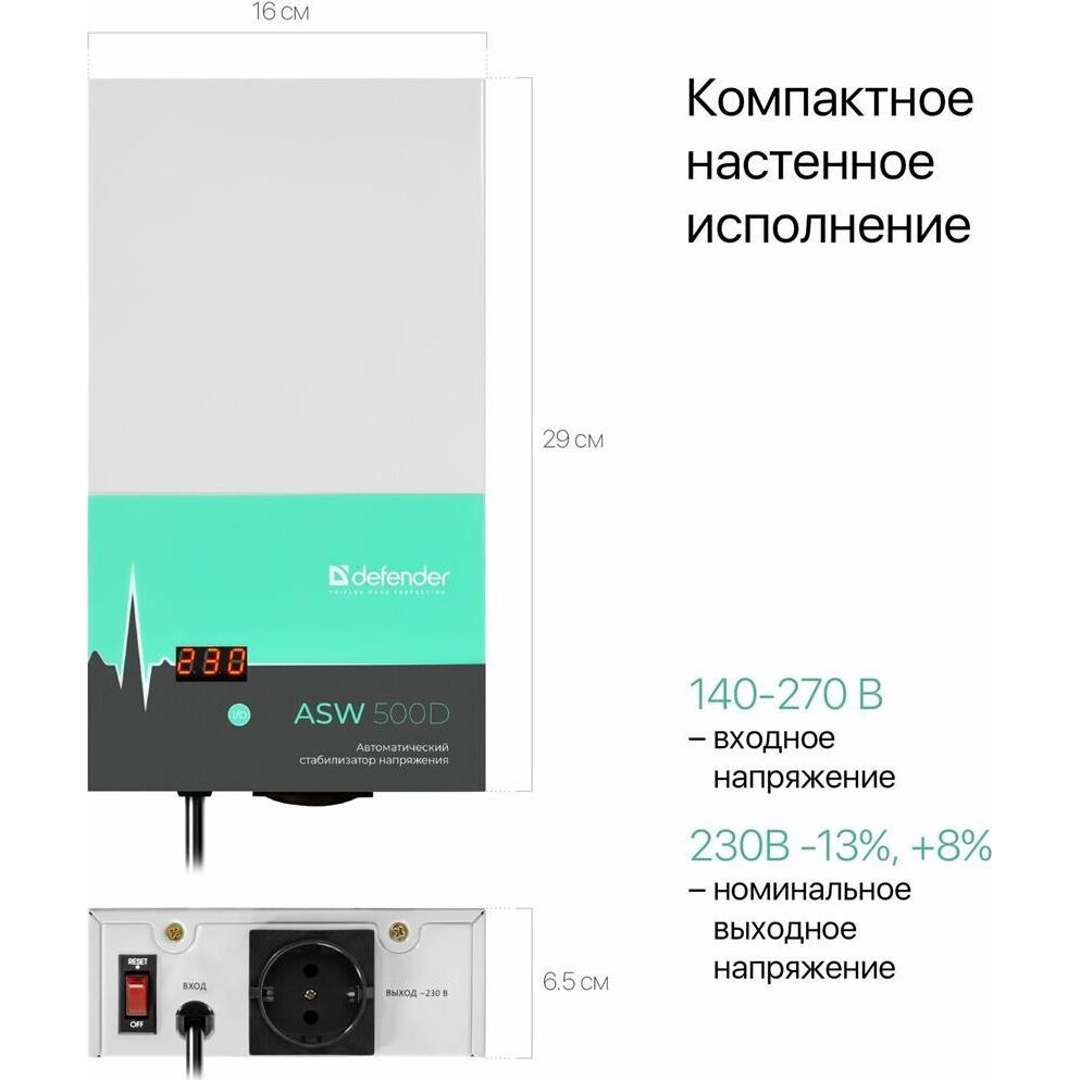 Максимальная полная мощность при входящем напряжении 220В: 500 ВА, Максимальная полная мощность при входящем напряжении 170В: 300 ВА, Номинальное выходное напряжение 230В -13%, +8%, Номинальная частота переменного тока: 50 Гц, Число фаз: 1, Время переключения: 20 мс,Защитные функции: Защита от повышенного напряжения, Защита от пониженного напряжения, Защита от перегрева, Защита от перегрузки, Диапазон входного напряжения: 140–270 В, Крепление на стену, Размеры без упаковки 29.0 x 6.5 x 16.0 см.