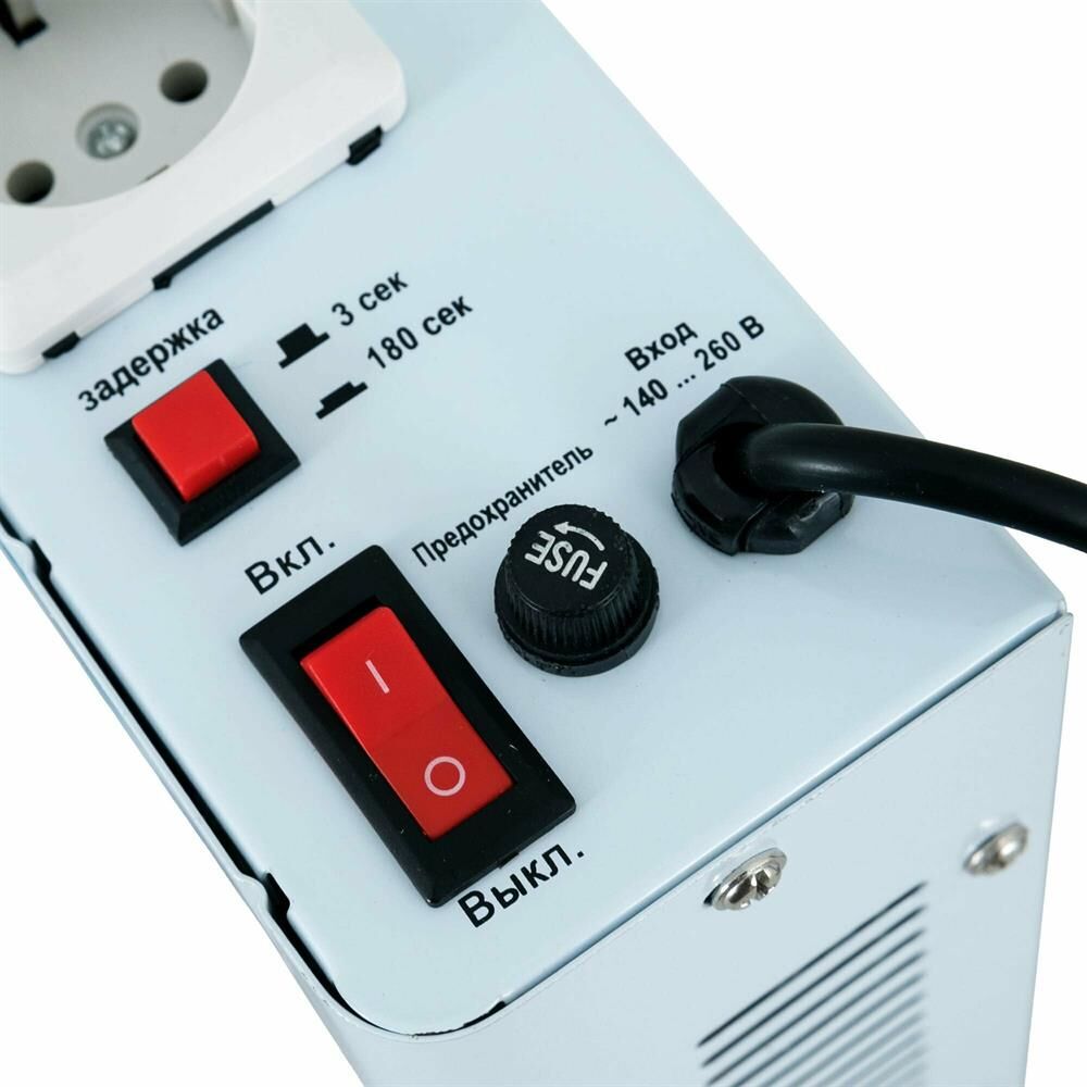 Тип стабилизации: Релейный. Мощность: 500 ВА. Диапазон стабилизации: 140-260 В. Рабочий диапазон: 130-275 В. Точность стабилизации: ±8%. Количество реле: 4. Частота: 50 Гц. Материал корпуса: металл. Кнопка выбора задержки выходного напряжения: есть (3 или 180 с). Габаритные размеры: 220х150х75 мм. Вес: 2,3 кг.