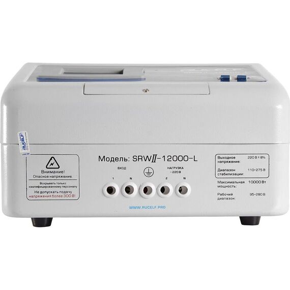 Тип стабилизации: Релейный Диапазон стабилизации: 110-270 В Рабочий диапазон: 95-280 В Точность стабилизации: ±8% Мощность: 12000 ВА Габаритные размеры (ДхШхВ): 540х405х270 мм Вес: 22,5 кг