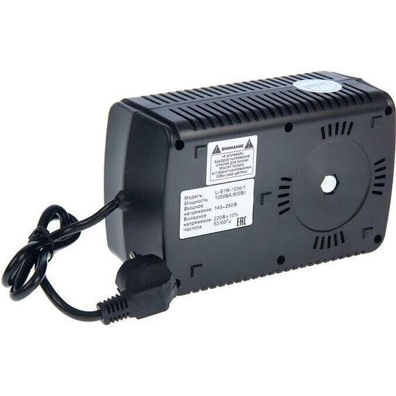 Однофазный электронны(релейный) стабилизатор,номинальная мощность 1,0кВА,диапазон входного напряжения 145-280В,выходное напряжение 220+/-10%В,частота 50/60Гц,точность стабилизации 10%,Макс.ток 4,6А, 20мс. Размер: 213x125x92мм.