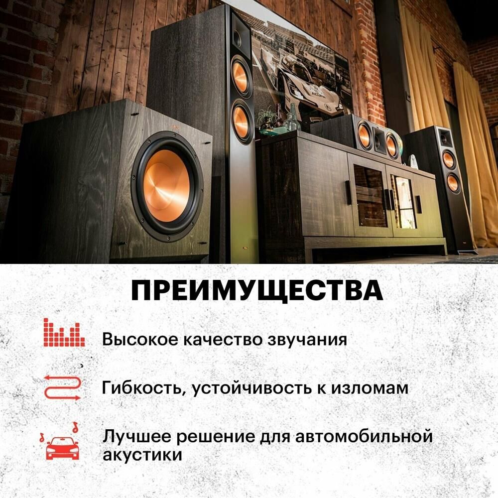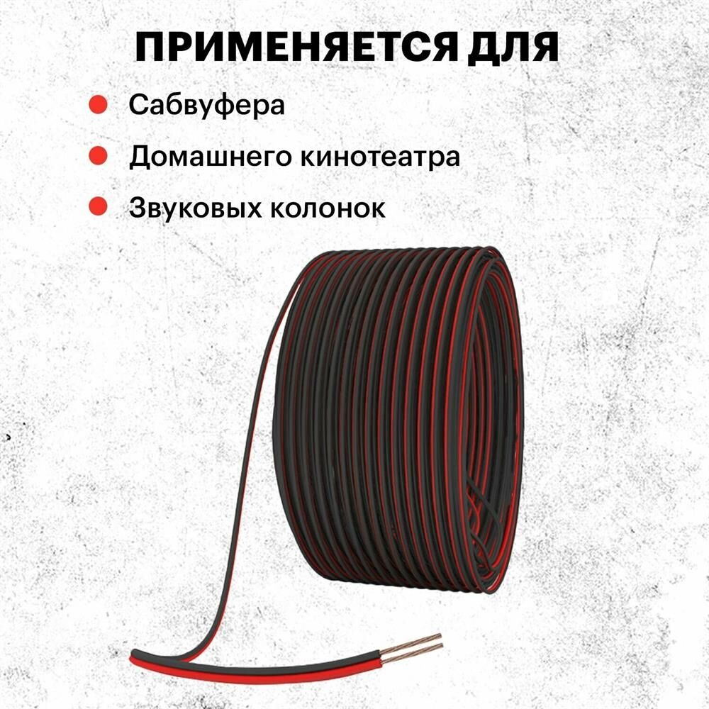 Кабель акустический состоит из двух параллельных многожильных проводников, материал - ССА, содержание меди - 30%, изоляция - RVC - поливинилхлорид черного и красного цвета, сечение - 2х0,25 мм, упаковка - бухта (100м), цена указана за бухту.