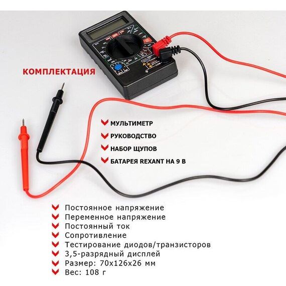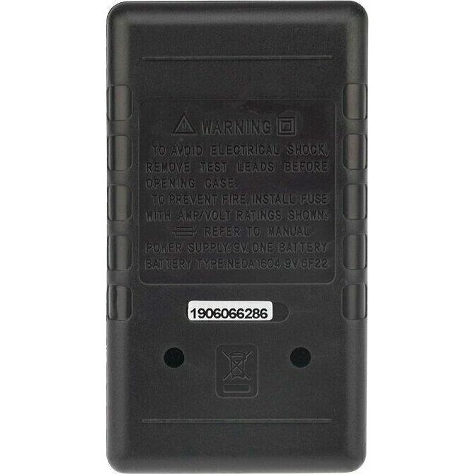 Характеристики: Постоянное напряжение: 200 mВ (±0.5%+3), 2000 мВ/20 В/200 В (±0,8%+5), 1000 В (±1,0%+5) Переменное напряжение: 200 В/750 В (±2,0%+10) Постоянный ток: 200 мкА/2000 мкА/20 мА (±1.8%+2), 200 мА (±2,0%+2), 10 A (±2.0%+10) Сопротивление: 200 Ом (±1,0%+10), 200 Ом/20 КОм/200 КОм/2000 КОм (±1,0%+4) Тестирование диодов Прозвонка целостности цепи Генератор прямоугольного сигнала (меандр) 3,5-разрядный дисплей Размер: 70х126х26 мм Тип батареи: PROconnect 9 В «Крона» (в комплекте) Вес: 108 г Комплектация: мультиметр, измерительные щупы, батарея, инструкция, упаковка.
