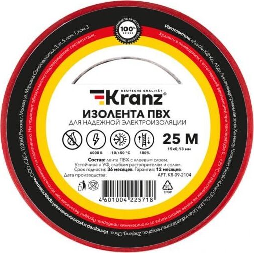 Изоляционная лента KRANZ (KR-09-2104) 0.13Х15 ММ, 25 М, КРАСНАЯ