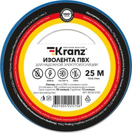 Изоляционная лента KRANZ (KR-09-2105) 0.13Х15 ММ, 25 М, СИНЯЯ