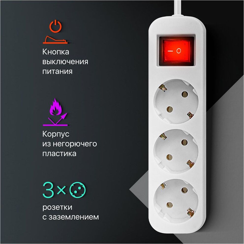 Удлинитель с заземлением, Максимальная суммарная мощность нагрузки 2200 Вт, Максимальный ток нагрузки 10 А.