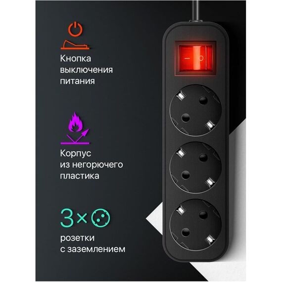 Номинальное напряжение/частота: 230 В / 50 Гц, Максимальная суммарная мощность нагрузки: 2200 Вт, Максимальный ток нагрузки: 10 А, Розетки с заземлением: 3 шт., Длина: 1.8 м.