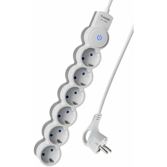 "Бытовой удлинитель белого цвета с кнопкой включения, корпус выполнен из прочного ABS пластика с 6 гнёздами, которые имеют защитные шторки, 10 А, 1.5м ПВС провод 3х1 мм2, темп. Эксплуатации 1...35 °C, ном. Частота 50 Гц, напряжение 220В, IP20, макс. Мощность 10А 2200 Вт. Китай.