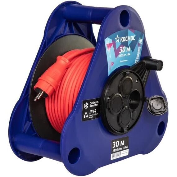 Удлинитель КОСМОС (катушка-треугольник) 16А 3500Вт 4 гнезда КГ 2*2,5 (30м) IP44 УКП. Новая треугольная конструкция-максимально устойчива и работает в любом положении, даже если опрокинется, каждая точка опоры может быть ручкой, провод не слетает с катушки. Удобство переноски и хранения. Морозостойкий провод КГ-ХЛ сечением 2.5 мм обладает повышенной износостойкостью. Морозостойкость до -35°С. Ярко-красный цвет провода. Яркий кабель-хорошо заметен в траве, пыли, снегу и в условиях плохой видимости. Защитные крышки для защиты от пыли и влаги. Катушки с KG кабелем комплектуются каучуковой разборной вилкой.