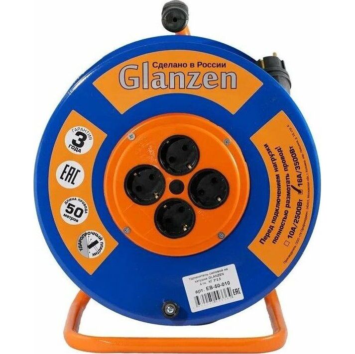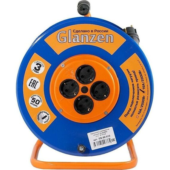 Удлинители GLANZEN EB-50-010, на катушке, с/з, 4 роз - 50м
