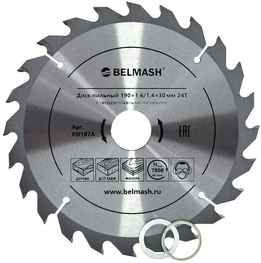 Диск пильный BELMASH 190 1,6/1,4 30/25,4/22,2 24Т с твердосплавными напайками, которые делают зубья более острыми и износостойкими. Градусы заточки: передний угол 15 градусов, задний угол 15 градусов. Тип зуба ATB: переменные зубья с разносторонним углом наклона главной задней поверхности. Толщина зубьев пильного диска 2,2 мм. Максимальная частота вращения – 7800 об./мин. Посадочный диаметр - 30 мм. В комплекте имеется два переходных кольца на внутренний диаметр 25,4 и 22,2 мм. Применение: чистовой поперечный и продольный распил древесины, фанеры, МДФ, ДСП, ОСП. Диск соответствует требованиям Технического регламента Таможенного Союза 010/2011 «О безопасности машин и оборудования».