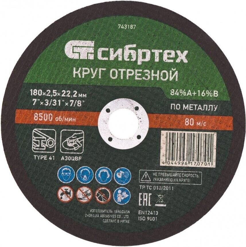 Круг отрезной СИБРТЕХ Круг отрезной по металлу, 180 х 2.5 х 22.2 мм, 84%A+16%B