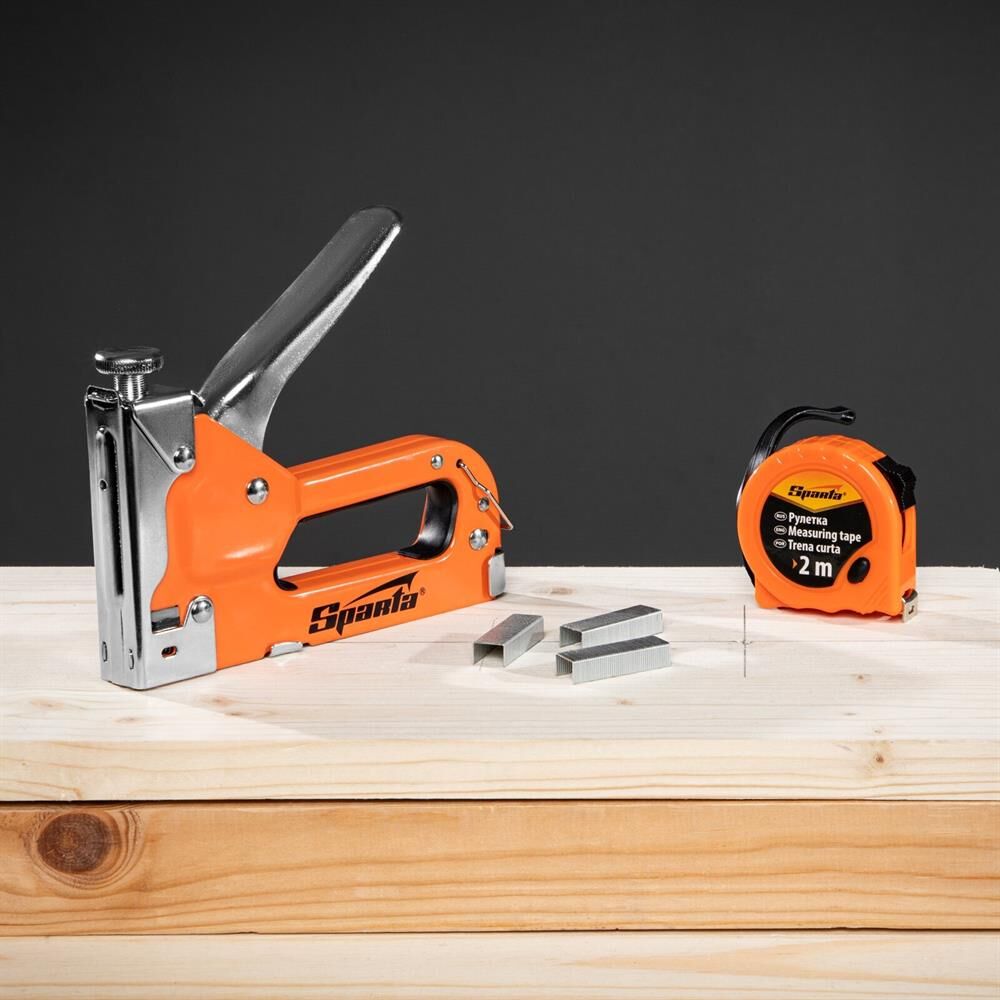 Степлер SPARTA Набор: степлер мебельный регулируемый, скобы 500 шт, рулетка 2 м, тип скобы 53, 4-14 мм 42003
