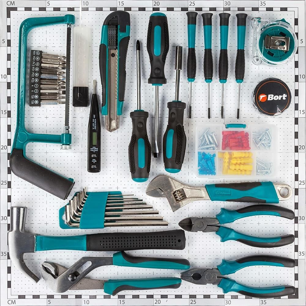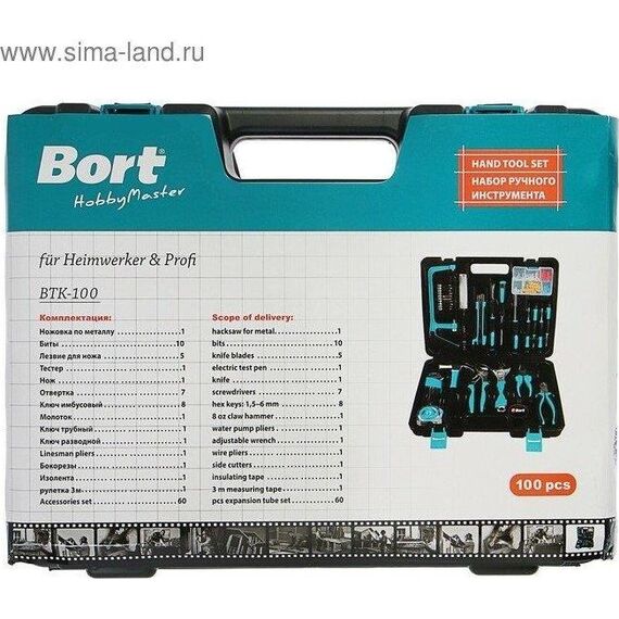 Предметов в наборе 100 шт, Материал Сталь, Вес 3,7 кг, размер упаковки 39,5x30x8 см, Ножовка по металлу (1 шт) Биты (10 шт) Лезвие для ножа (5 шт) Тестер (1 шт) Нож (1 шт) Отвертка (7 шт) Ключ имбусовый (8 шт) Молоток (1 шт) Ключ трубный (1 шт) Ключ разводной (1 шт) Плоскогубцы (1 шт) Бокорезы (1 шт) Изолента (1 шт) Набор насадок (60 шт) Рулетка (1 шт)