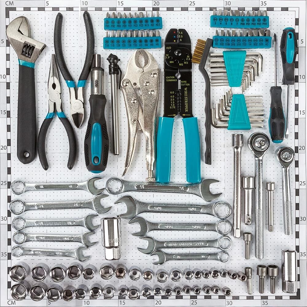 В КОМПЛЕКТЕ Ключ шестигранный (16 шт) Держатель для бит 170 мм с трещеткой (1 шт) Бита 25 мм (40 шт) Ключ разводной (1 шт) Тонкогубцы (1 шт) Бокорезы (1 шт) Манометр (1 шт) Металлическая щетка (1 шт) Пинцы 7" (1 шт) Отвертка (2 шт) Приспособление для зачистки проводов (1 шт) Ключ гаечный (10 шт) Рукоятка с трещеткой квадрат 1/4 (1 шт) Рукоятка с трещеткой квадрат 3/8 (1 шт) Торцевая головка квадрат (40 шт) Удлинитель квадрат 1/4 3 (1 шт) Удлинитель квадрат 3/8 3 (1 шт) Удлинитель квадрат 3/8 6 (1 шт) Свечной ключ квадрат 3/8 16мм (1 шт) Свечной ключ квадрат 3/8 21 мм (1 шт).