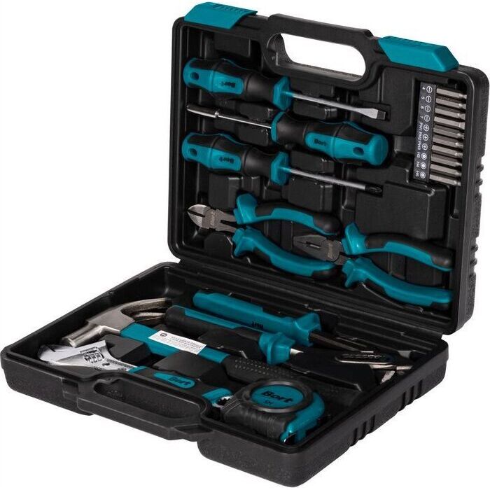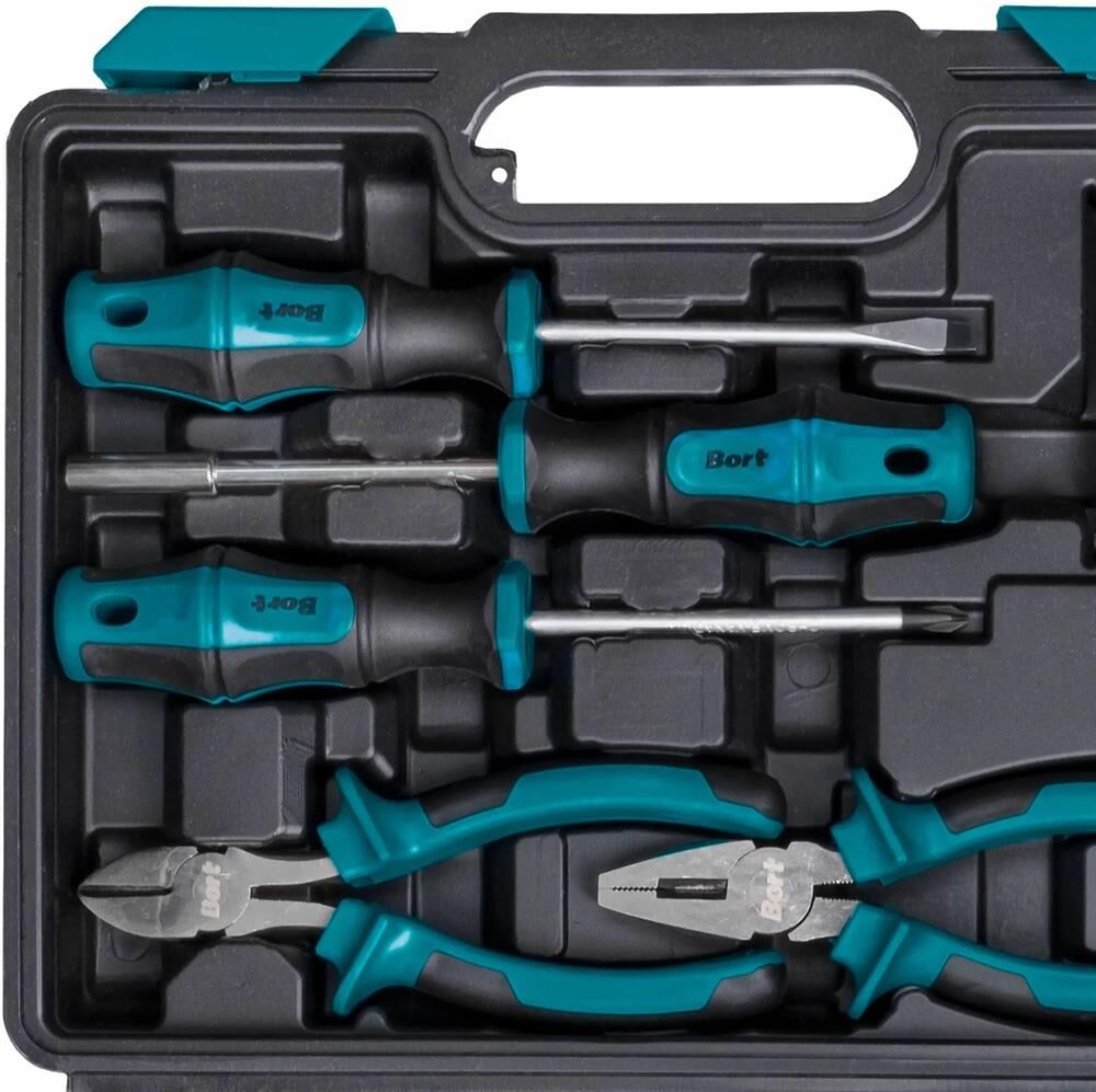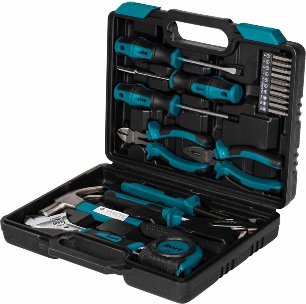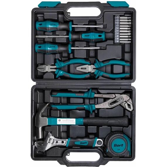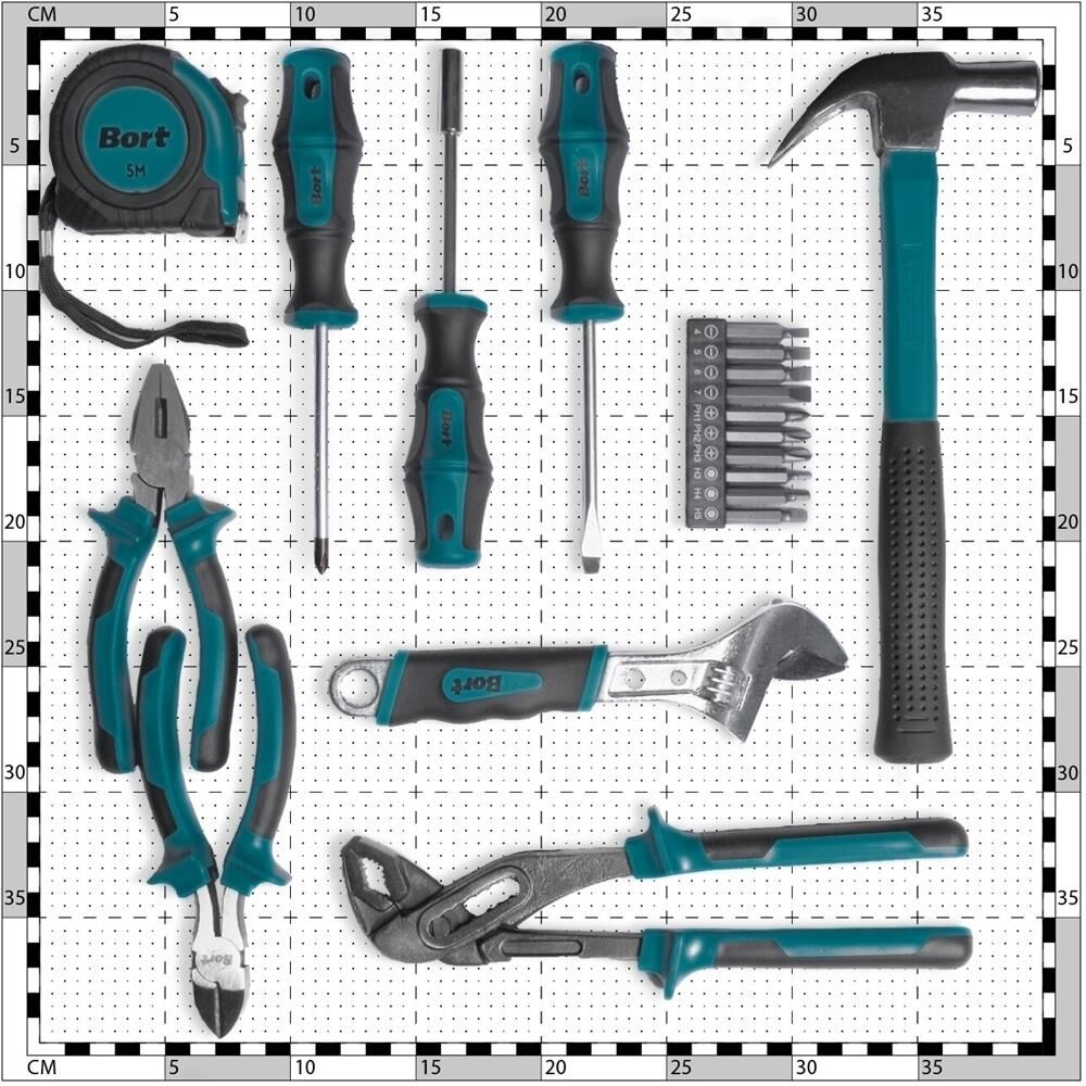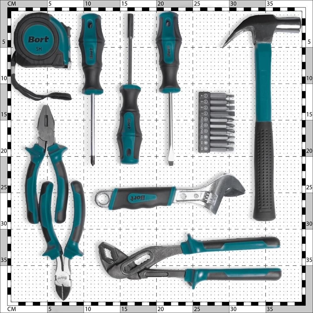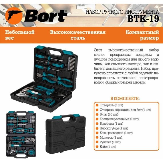 Материал: Сталь. Модель: BTK-19. Предметов в наборе, шт: 19. Отвертка 2шт. Отвертка-держатель для бит 1шт. Биты 10шт. Клещи переставные 1шт. Бокорезы 1шт. Плоскогубцы 1шт. Ключ разводной 1шт. Молоток 1шт. Рулетка 1шт. Кейс.