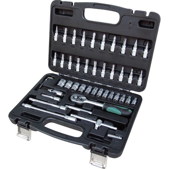 Набор ручного инструмента, Предметов в наборе 46 шт, материал Сталь CRV, Вес брутто 1,42 кг, Габариты упаковки 26x5x28 см, В КОМПЛЕКТЕ 1/4" Головки (13 шт), Головки торцевые 1/4" со вставкой (21 шт), Кардан шарнирный 1/4" (1 шт), Удлинитель 1/4": 50 мм (1 шт), Удлинитель 1/4": 100 мм (1 шт), Ключ трещеточный 1/4" (1 шт), Вороток Т-образный 1/4" (1 шт), Удлинитель гибкий 1/4" (1 шт), Отвертка-держатель для бит (1 шт), Адаптер шестигранный (1 шт), Ключ шестигранный (4 шт).