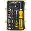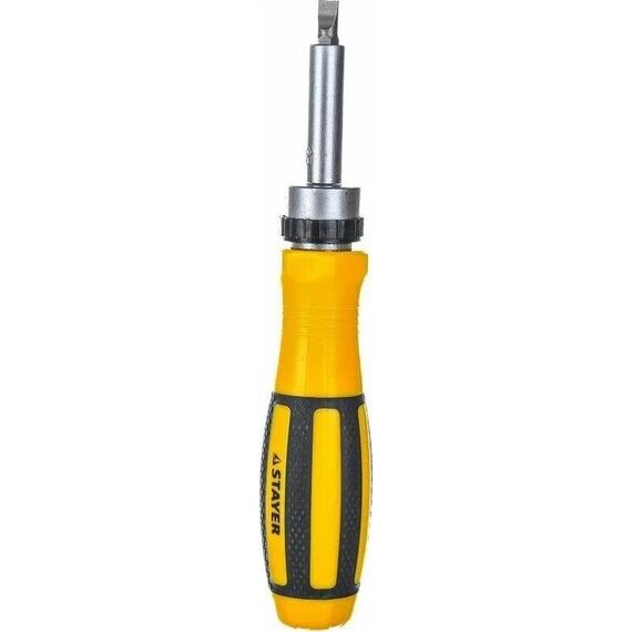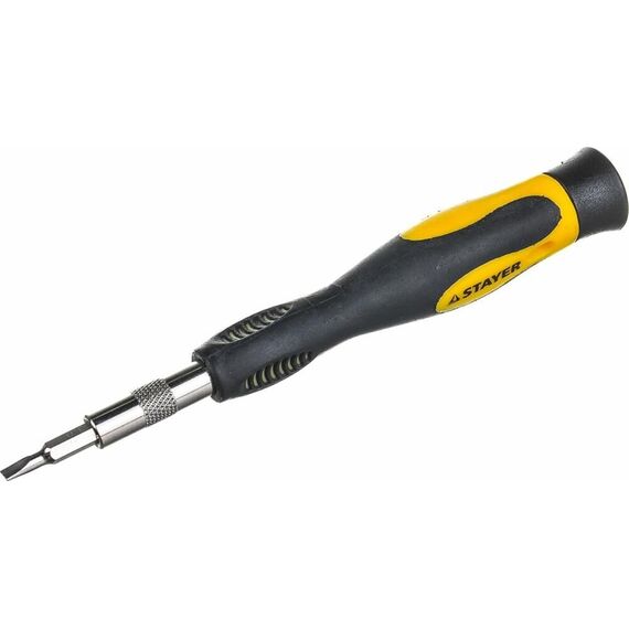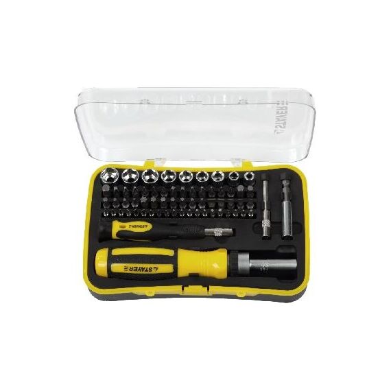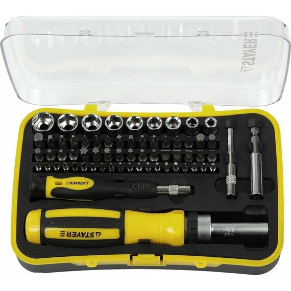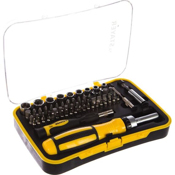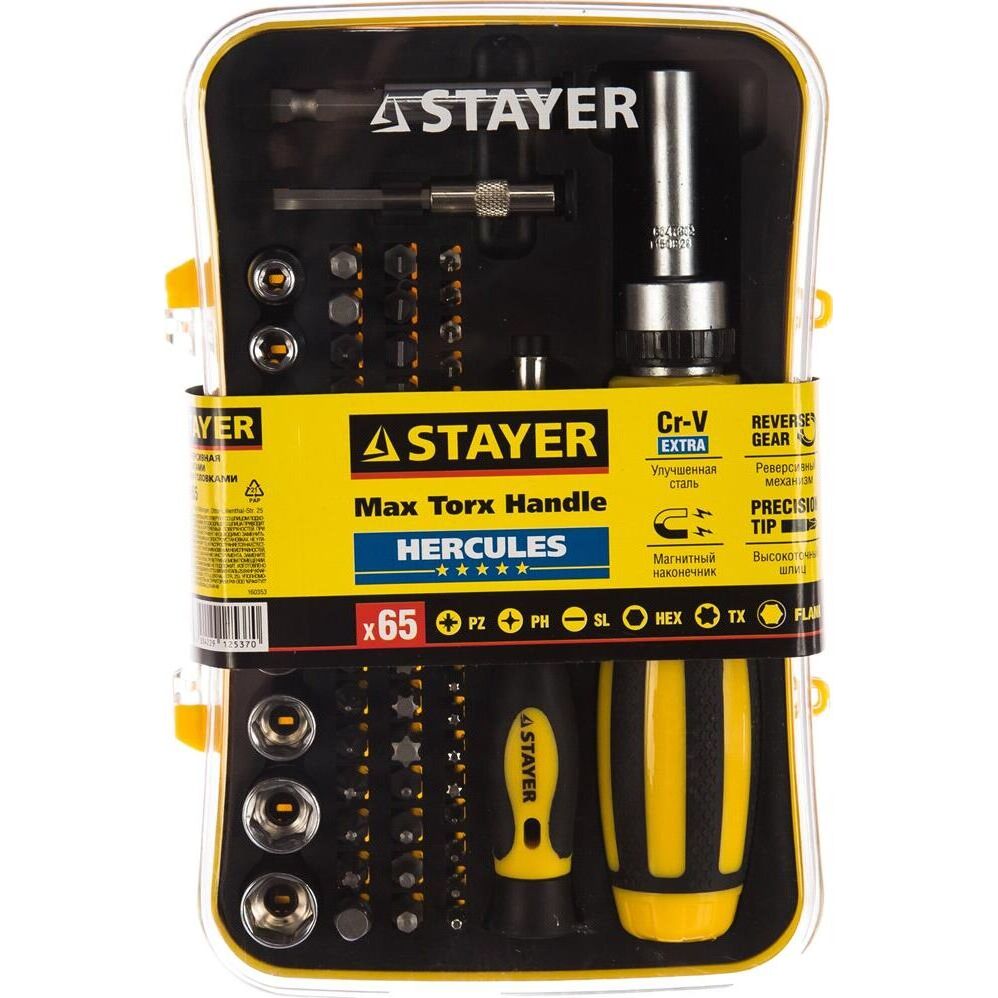 Набор насадок с реверсивной отверткой 65 предметов STAYER MASTER 25310-H65 - комплект для осуществления работ с крепежными элементами. Обеспечивает комфорт при закручивании и точность. Технические характеристики набора STAYER 25310-H65 Тип наконечника набор Количество насадок в наборе, шт 60 Материал рукояти двухкомпонентная Трещоточный механизм есть Диэлектрическое покрытие нет Намагниченный наконечник да Ударная нет Для точных работ да Форма ручки Прямая Материал насадок CrV Тип шлица PH; SL; PZ; TORX; HEX; торцевые головки, квадрат Комплектация * Отвертка для точных работ с магнитным фиксатором; Биты 1/4" (31 шт.); Адаптер с магнитным фиксатором 60 мм; Торцевые головки 1/4" (9 шт.); Переходник HEX 1/4" - SQ 1/4"; Биты для точных работ (20 шт.); Адаптер для точных работ с магнитным фиксатором 60 мм; Пластиковый бокс.
