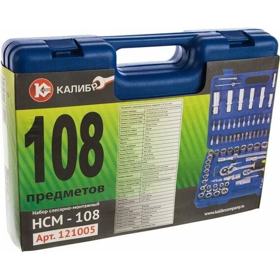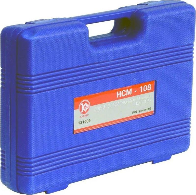 Набор слесарно-монтажный Калибр НСМ-108 (артикул 121005) содержит 108 предметов и предназначен для проведения слесарных работ. Все инструменты выполнены из хромванадиевой стали со специальным покрытием для защиты от коррозии. Набор упакован в удобный пластиковый кейс.