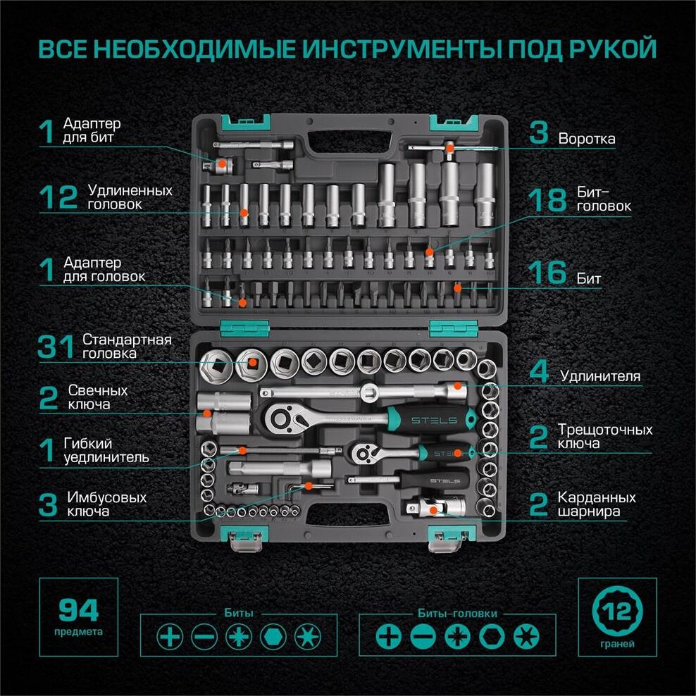 Наборы инструмента STELS Набор инструментов, 1/2", 1/4", CrV, пластиковый кейс 94 предм. 14106
