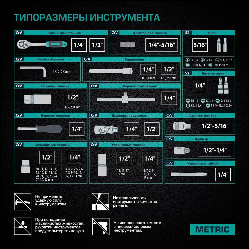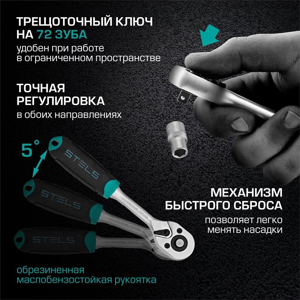 Наборы инструмента торговой марки STELS разработаны специально для автолюбителей и центров технического обслуживания. Каждый этап производства контролируется в соответствии с международными стандартами. Головки и комбинированные ключи изготовлены из хромованадиевой стали, придающей инструменту исключительную твердость в сочетании с легкостью. Биты, биты-вставки и отвертки производятся из стали S2, улучшающей свойства инструмента. Набор комплектуется трещотками с реверсом и быстрым сбросом, трещоточный механизм имеет 72 зуба и обеспечивает исключительную мягкость и плавность в работе. Шаг зуба 5 град. Все наборы упакованы в кейс, изготовленный из жесткого противоударного пластика, с металлическими застежками. Наборы инструмента STELS пригодятся вам не только в автомобиле. С их помощью можно проводить бытовой ремонт дома и на даче, ремонт бытовых конструкций и садовой техники. На все наборы инструментов STELS предоставляется пожизненная гарантия (подробнее об условиях гарантии вы можете узнать из гарантийного т