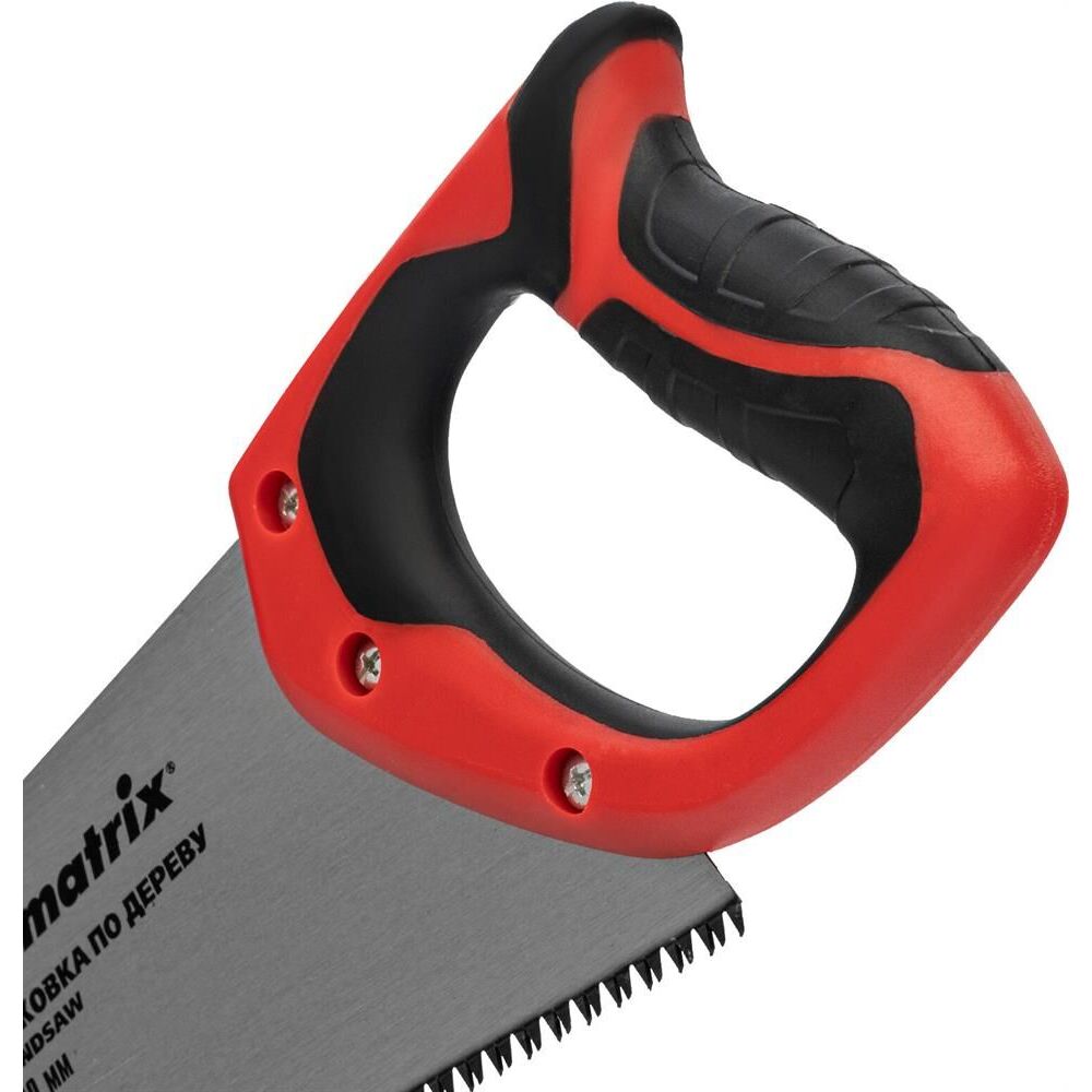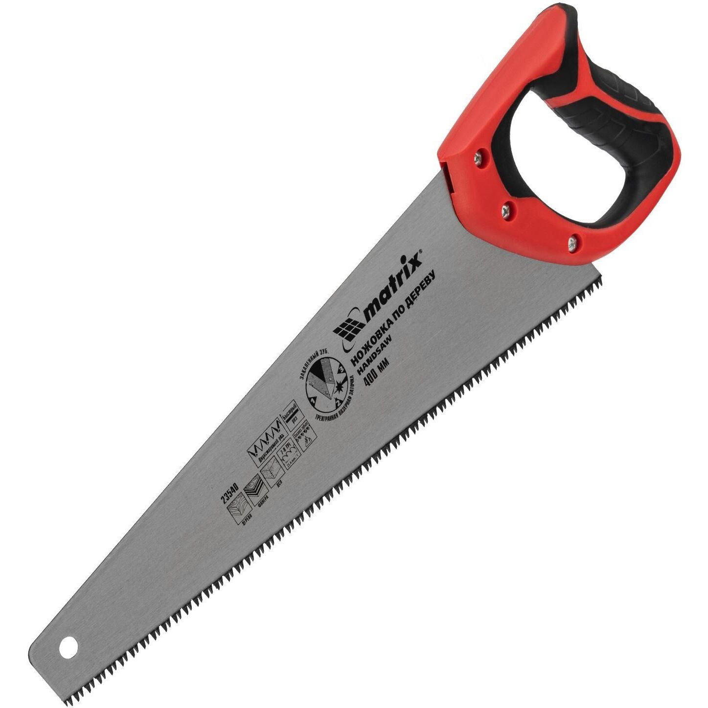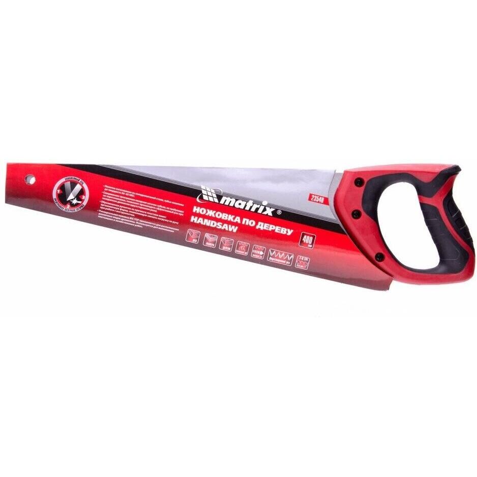 Ножовка по дереву Matrix 23540 с полотном длиной 400 мм, с калеными зубьями с 3D-заточкой и шагом 7-8 TPI, с двухкомпонентной рукояткой, используется для продольного и поперечного пиления досок, брусков, листов фанеры, ДСП. Благодаря трехгранной заточке зубьев пила характеризуется высокой производительностью. Шаг зубьев составляет 7-8 TPI, что обеспечивает быстрый и качественный рез. Ножовка пригодится в столярной мастерской, а также будет полезна в хозяйстве.ПреимуществаМеханическая прочность — полотно изготовлено из холоднокатаной пружинной стали 65Mn, устойчивой к динамическим нагрузкам.Высокий рабочий ресурс — зубья закалены и имеют твердость 50-55 HRC.Коррозионная стойкость — на полотно нанесено защитное лаковое покрытие.Комфорт во время работы — эргономичная двухкомпонентная рукоятка с резиновыми вставками имеет усовершенствованный дизайн и удобно лежит в руке, снижая нагрузку на кисть при длительном пилении.Надежность — ножовка изготовлена на японском оборудовании и прошла строгий контроль качества.