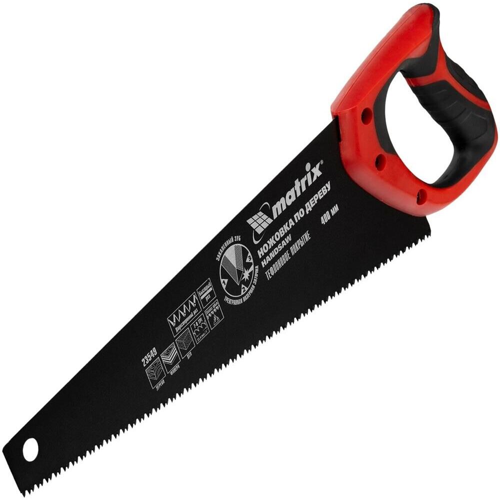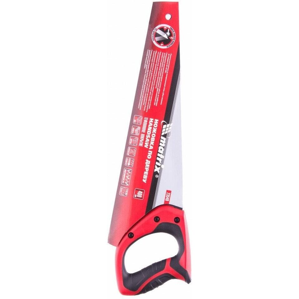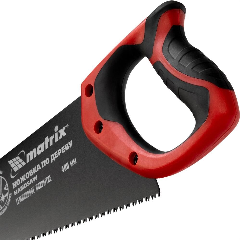 Ножовка по дереву Matrix 23549 с полотном длиной 400 мм, калеными зубьями с шагом 7-8 TPI и 3D-заточкой, с тефлоновым покрытием полотна и 2-компонентной рукояткой, пилит древесину, фанеру и ДСП. Подходит для продольного и поперечного пиления, используется для быстрой распиловки заготовок. Трехгранная заточка зубьев обеспечивает повышенную производительность. Ножовка будет полезна столяру, плотнику, пригодится также в домашнем хозяйстве.ПреимуществаПрочность — полотно из холоднокатаной стали 65Mn выдерживает динамические нагрузки.Высокий ресурс — закаленные зубья твердостью 50-55 HRC долго держат заточку, полотно с тефлоновым покрытием не боится коррозии.Повышенная скорость распиловки — тефлоновое покрытие улучшает антифрикционные свойства полотна.Эргономичность — двухкомпонентная рукоятка удобно лежит в руке, уменьшая усталость во время длительной работы.Надежная конструкция — рукоятка крепится к полотну при помощи 3-х винтов.Гарантированное качество — инструмент изготовлен на заводе с японским оборудованием и прошел строгий контроль на каждом этапе производства.