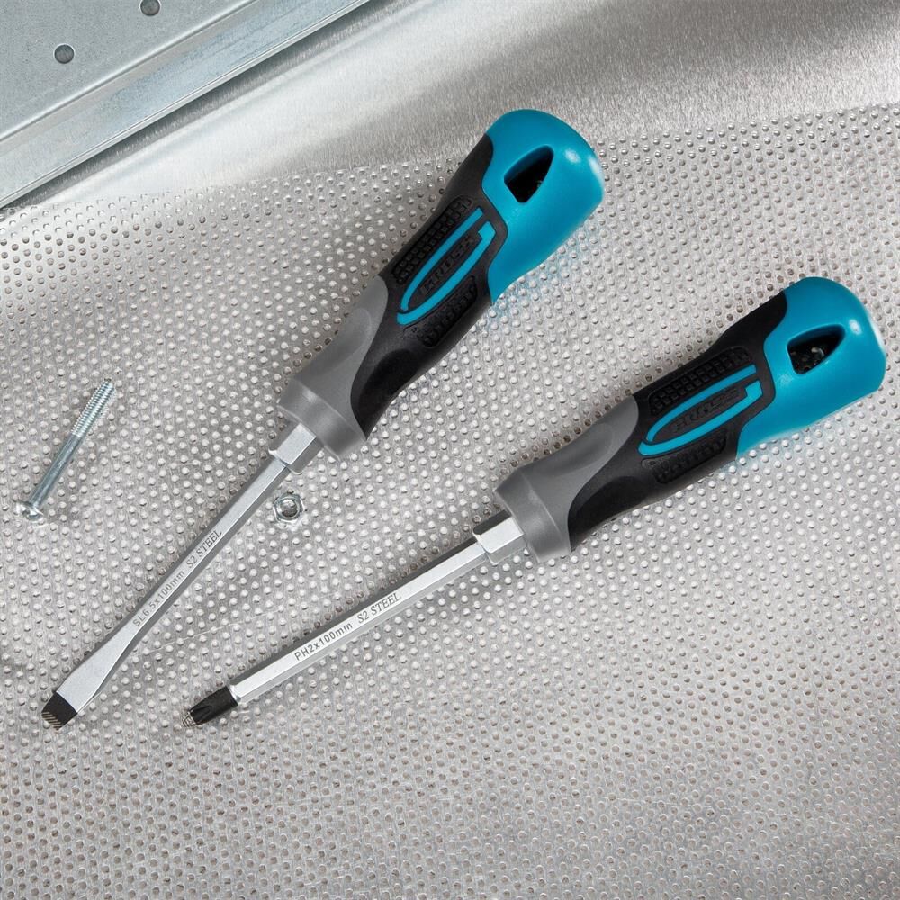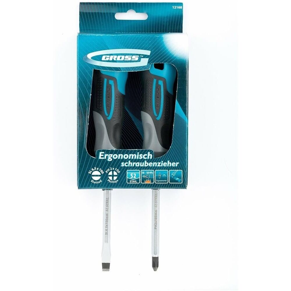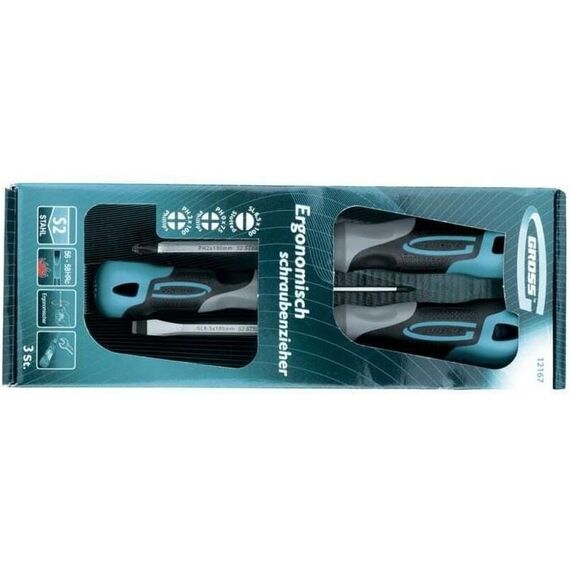 Комбинированный набор Gross 12167 включает 3 отвертки из стали S2, с трехкомпонентными рукоятками, позволяющих осуществлять монтаж/демонтаж крепежных элементов типа Philips и Slotted. Он используется для решения профессиональных задач при проведении строительных, ремонтных и монтажных работ. Длина стержней отверток составляет 75-100 мм, поэтому набор оптимален для работы с легкодоступными резьбовыми соединениями.ПреимуществаИзносостойкость и долговечность — отвертки изготовлены из высококачественной инструментальной стали S2.Высокий ресурс — стержни отверток прошли индукционную закалку, их твердость составляет 56-58 HRC.Удобство использования — шлицы со специальными насечками и фосфатным покрытием надежно сцепляются с головкой крепежа, что снижает риск его повреждения.Защита от ржавчины — хромовое покрытие стержней предотвращает образование коррозии.Намагниченные наконечники — крепеж удобно направлять в отверстие одной рукой, т.к. он не спадает со шлица.Расширенный функционал — шестигранные выступы на рукоятк