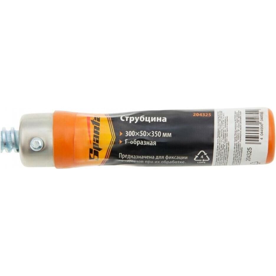 F-образная струбцина Sparta 204325 длиной 350 мм и величиной зажима 300 х 50 мм позволяет фиксировать заготовки из металла, древесины и других материалов для их соединения или обработки. Используется в столярном и слесарном деле. Деталь помещают между губками, одна из которых подвижна и служит для регулировки величины захвата. Винтовой зажим позволяет фиксировать заготовку со значительным усилием. Элементы конструкции выдерживают высокую температуру, поэтому струбцина подходит для проведения сварочных работ, при этом пластиковые накладки необходимо снять.ПреимуществаПрочность — стальная штанга выдерживает значительные изгибающие нагрузки.Длительный срок службы — оцинкованный винт устойчив к коррозии.Аккуратная работа — защитные накладки на губках предотвращают повреждение детали.Комфортная эксплуатация — удобная деревянная рукоятка надежно ложится в руку.