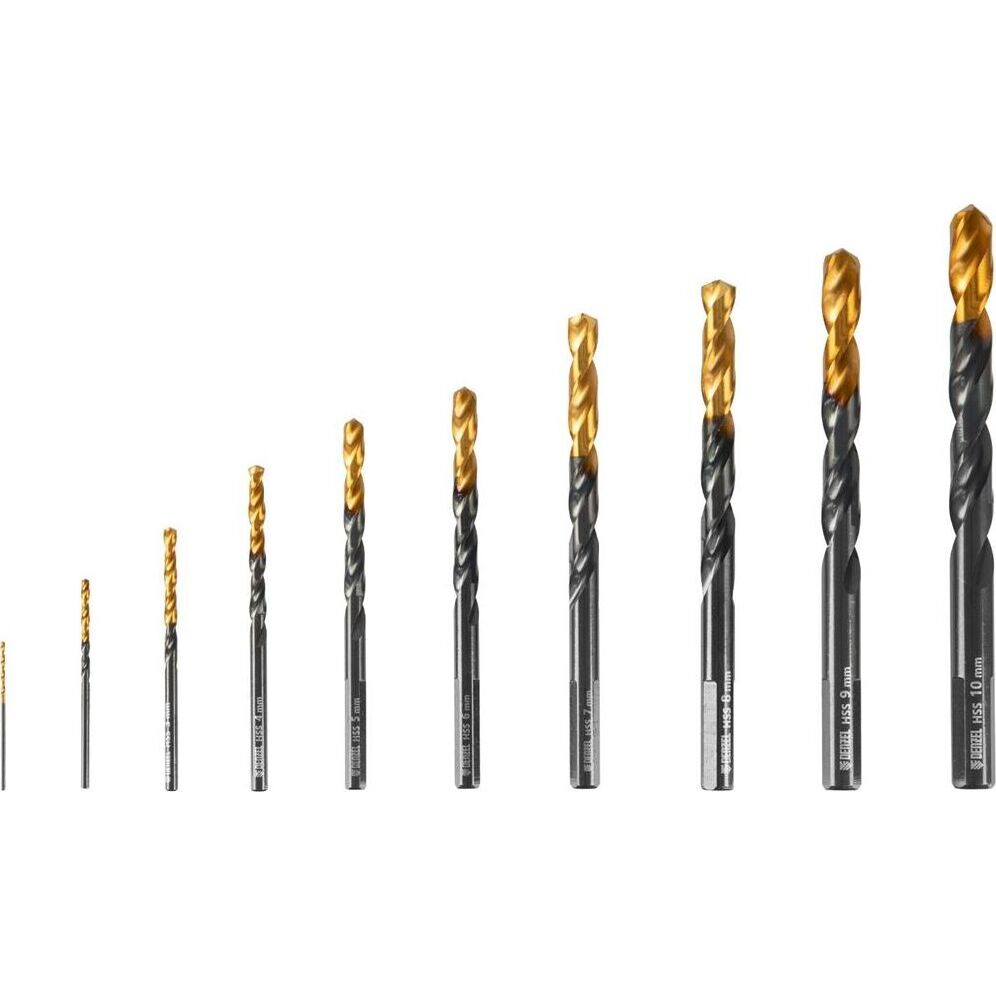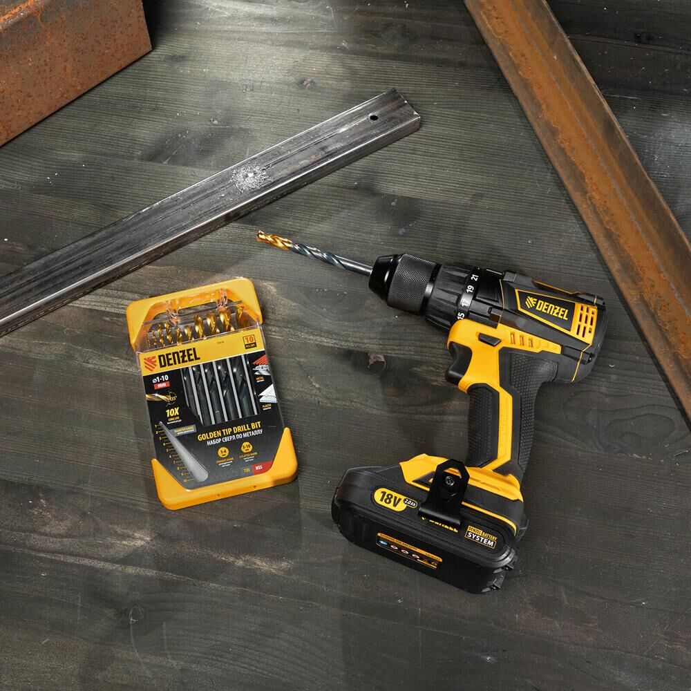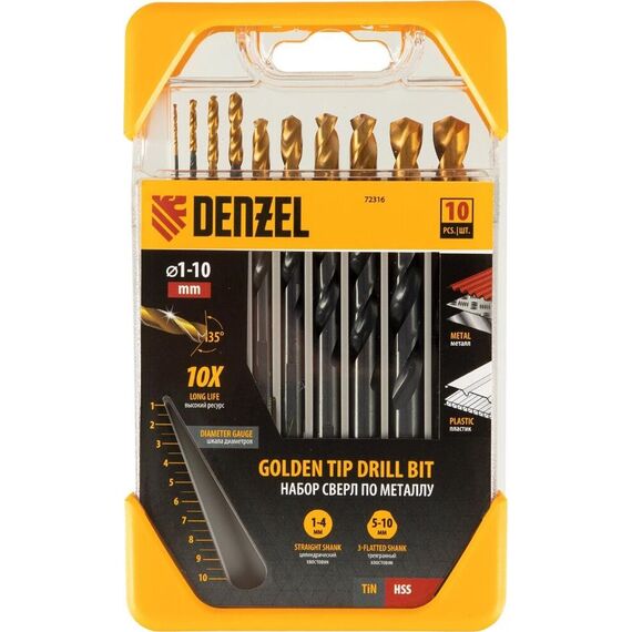 Набор сверл DENZEL Набор сверл по металлу, 1-10 мм, HSS-Tin, Golden Tip, 10 шт 72316