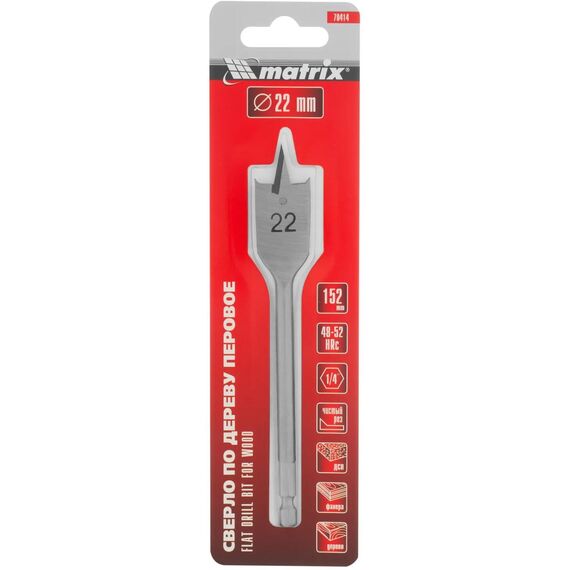 Перовое сверло по дереву Matrix 70414 диаметром 22 мм, с 6-гранным хвостовиком, имеет рабочую часть в виде «лопатки» с режущими кромками по бокам, поэтому эффективно для сверления глубоких сквозных и глухих отверстий.