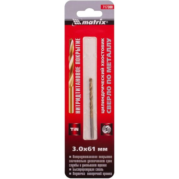 Сверло Matrix 717300 диаметром 3 мм, из стали HSS, с нитридтитановым покрытием и цилиндрическим хвостовиком, предназначено для получения отверстий в металле. Угол заточки 118° оптимален для работы с черными металлами, сталью, чугуном и твердой бронзой.